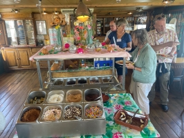 Rond half 7 stond er in de mooi gewelfde zaal beneden een buffet klaar. Het was een uitgebreid buffet met koude en warme voorgerechten, vis- vlees- en vegetarische hoofdgerechten en heerlijke toetjes als ijs en verschillende bavaroises en mousses. Er was zoveel mogelijk rekening gehouden met dieetwensen zoals glutenvrij eten, vegetarisch of niet. Dit kon men allemaal aangeven op het inschrijfformulier. Iedereen was zeer tevreden en vond het een heerlijk en uitgebreid buffet.